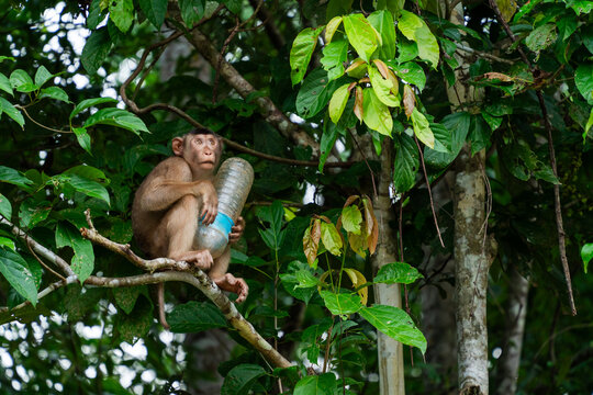 Monkey with Plastic Bottle in a Tree. Borneo, Malaysia