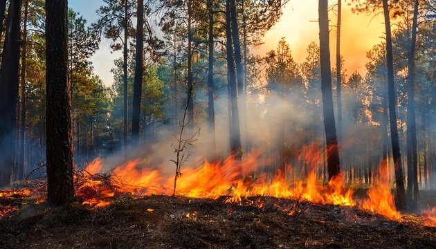 A forest ablaze with flames and smoke, highlighting the devastating impact of wildfires on nature.