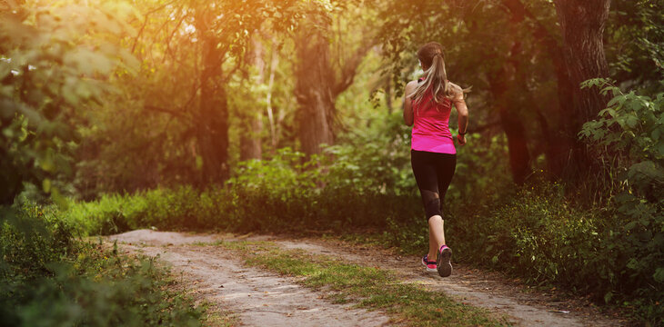 Young fitness woman running in the morning forest trail. Healthy fit living.
