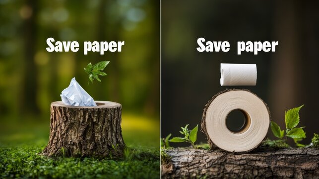 A split image highlighting the importance of paper conservation, with visuals of wood transformed into paper, conveying a strong environmental message.