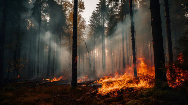 forest fire burning coniferous forest, ecology and earth protection problem, earth protection day, AI generated illustration