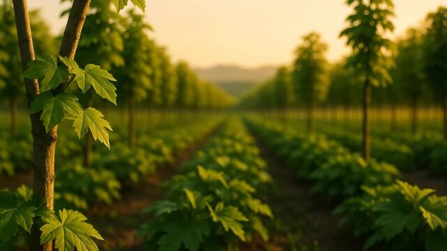 Organized tree plantation with aligned rows of maturing trees at sunset, focusing on healthy green maple-like leaves in sustainable agricultural or forestry environment.