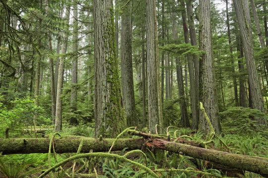 Douglas firs reach skyward in Cathedral Grove, MacMillian Provincial Park, Vancouver Island, British Columbia.