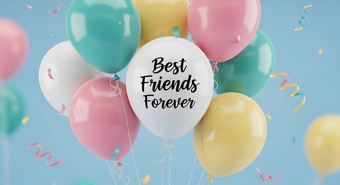 A cluster of colorful balloons, including pink, blue, yellow, and white, float against a blue background, with one central white balloon inscribed with best friends forever