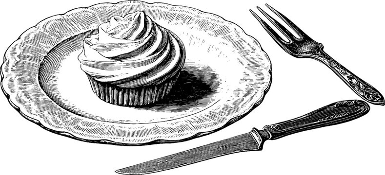 Elegant engraved vintage dessert plate with cupcake and cutlery design