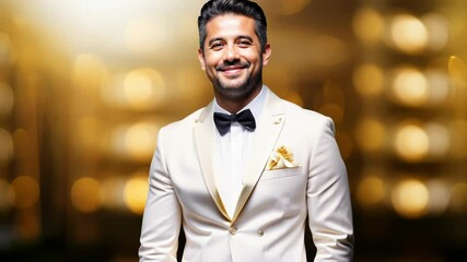 Handsome black man in a tuxedo at a celebration with falling confetti. Elegant gentleman at a formal event or gala. Success and achievement concept