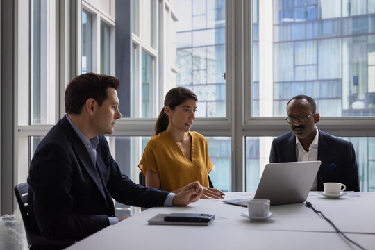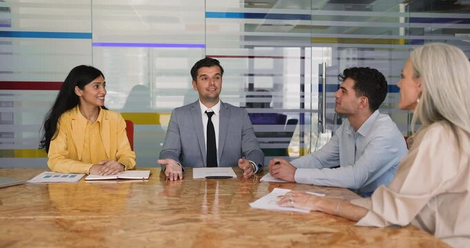 Company boss hold formal meeting with partners, investors or clients, make speech seated at desk with entrepreneurs share strategy, reporting, forecasting, brainstorming together in conference room