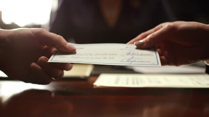 Hands Exchanging a Check at a Desk