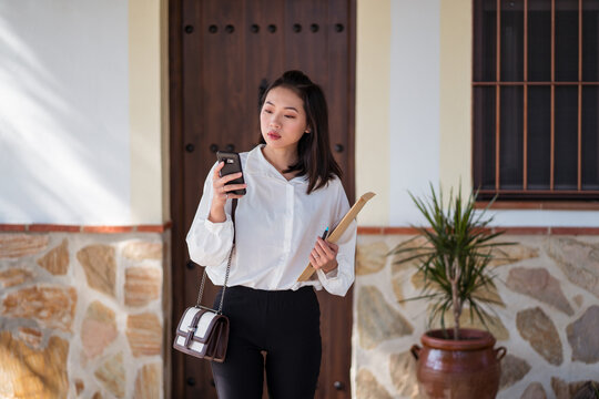 Serious ethnic woman with envelope checking smartphone
