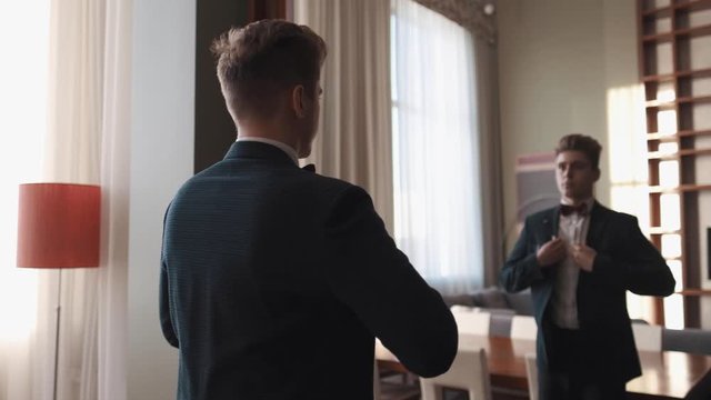 The groom in the black suit adjusts his bow tie of the white shirt - close up