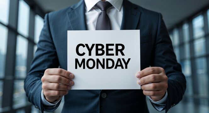 cyber Monday text on plain white paper in hand on guy on formal suit business concept background