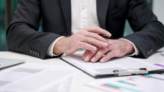 Close up of a male hand signing documents at a desk at a workplace in a business office. Seo or the boss in a formal suit looks through the folder with documentation and signs the contract with a pen