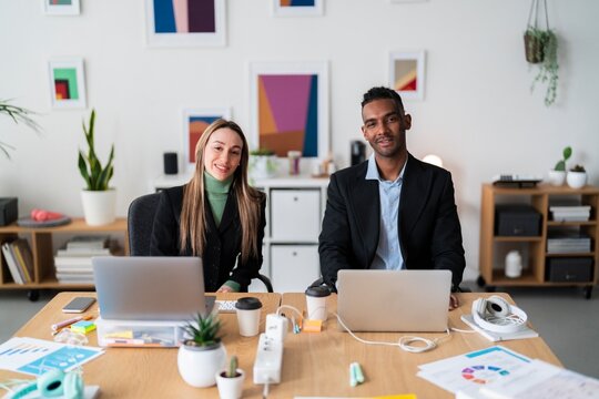 Confident young multiracial coworkers in formal wear browsing laptops while sitting at wooden table with documents and working together on new project in modern office
