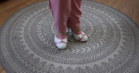 Legs in pink pants and female feet of a standing adult woman modeling white and pink high heels with a bow, gray doily, viewed from a high angle. Beauty, glamour and fashion concept