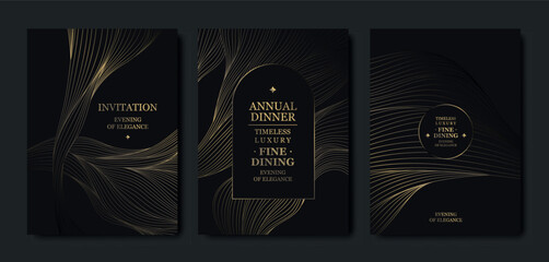 Modern cover design set. Gold abstract line pattern (wave curves) in premium colors: black and gold . Luxury wavy stripe vector layout for business background, certificate, brochure template