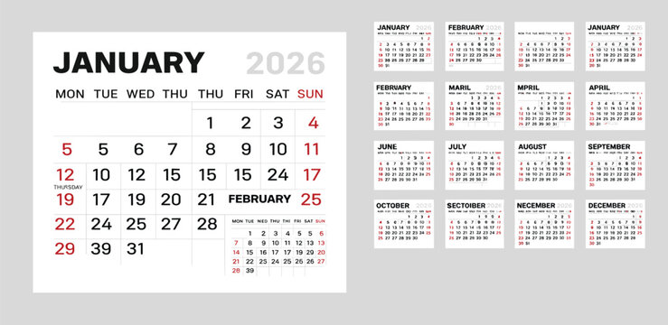 A complete annual calendar for the year 2026, featuring a simple and clean monthly grid layout. The week begins on Monday, ideal for planning and organization