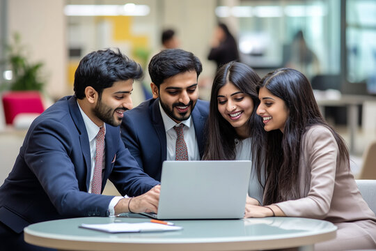 A group of four professionals from India, dressed in business attire, are gathered around a laptop, collaborating and smiling in a bright, modern office setting
