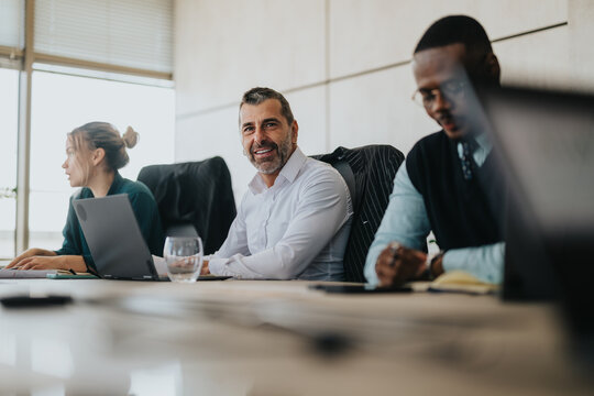 Business professionals in formal attire are gathered around a conference table, discussing strategy and making decisions together in a modern office setting. Teamwork in business setting.
