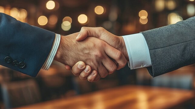Two businessmen shaking hands in a warm, softly lit office setting Image