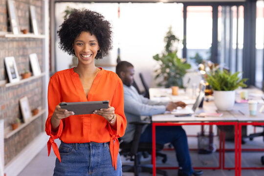 Woman smiling, engaged with digital tablet in modern office workspace. AI generated