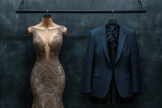 A shimmering gown and a tailored blazer hang side by side on a rack against a dark luxurious backdrop.