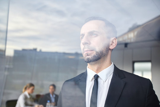 Serious businessman in formalwear looking through window while his colleagues preparing for conference on background