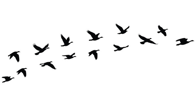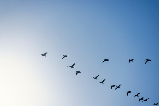 Silhouette of migrating birds flying together in sky in V formation. Flock of birds flying in formation silhouette