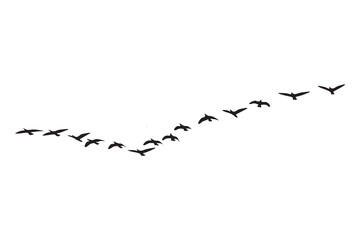 A flock of black Cormorants flying in V formation isolated on a white sky suitable for compositing
