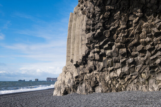 The famous Black Sand ocean Beach, mount Reynisfjall and Picturesque Basalt Columns, Vik, South Iceland. Dyrholaey Cape and rock formations in far.
