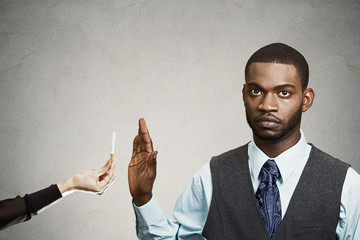 Portrait, headshot young business man says no to smoking