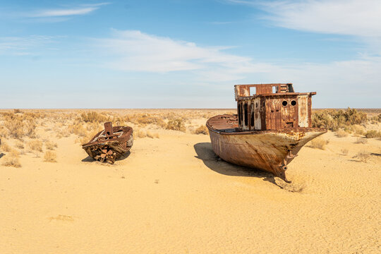 Rusty abandoned ships at the Ship cemetery at the former Aral sea coast in Moynaq Mo ynoq or Muynak , Uzbekistan