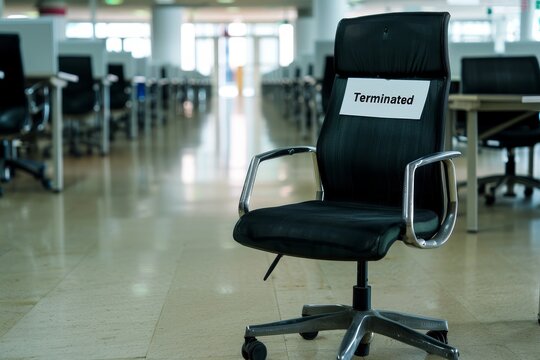 An empty office chair with a "Terminated" sign placed on it, signifying the absence of the former occupant. The office environment around it adds to the context of the firing.