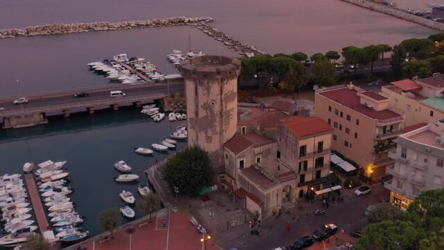 Formia, Torre di Mola, Sunset Aerial Footage - 4K - Flying around the tower and the harbour as cars pass by in the background - Warm sunset colors