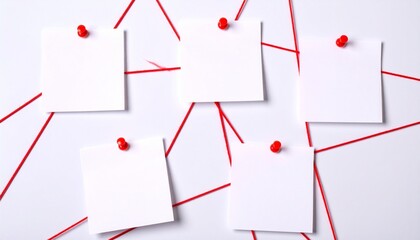 Five blank notes pinned with red strings on white surface, forming a visual network.