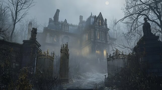 Gothic mansion surrounded by mist, broken windows, creaking iron gates, dead trees lining the pathway, pale moonlight illuminating the rooftop