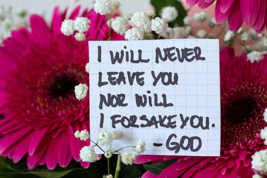 I will never leave you nor will I forsake you, God. Inspirational handwritten quote with flowers. Hebrews 13:5 text, biblical concept.