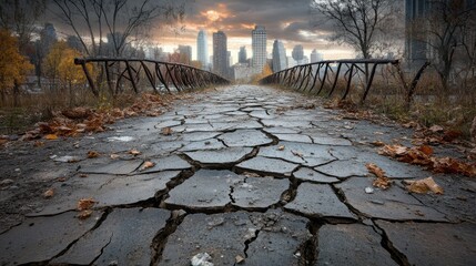 Shattered, deteriorating bridge with an empty, arid river below in a wasteland with ruined structures fading into the distance, marking a forsaken city.