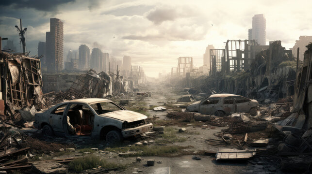 Apocalyptic cityscape with ruins and abandoned cars under a cloudy sky.