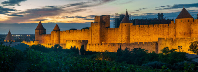 Lighted Carcassonne fortification walls seen from vineyards surrounding the city-Panorama.