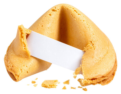 Broken Fortune Cookie with Fortune Paper Slip on White Surface, isolated on transparent background
