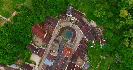 Aerial view of ancient town of Tonnerre with unusual water reservoir Fosse Dionne. Burgundy France