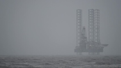 Gas rig situated off Ainsdale beach on cloudy and stormy day