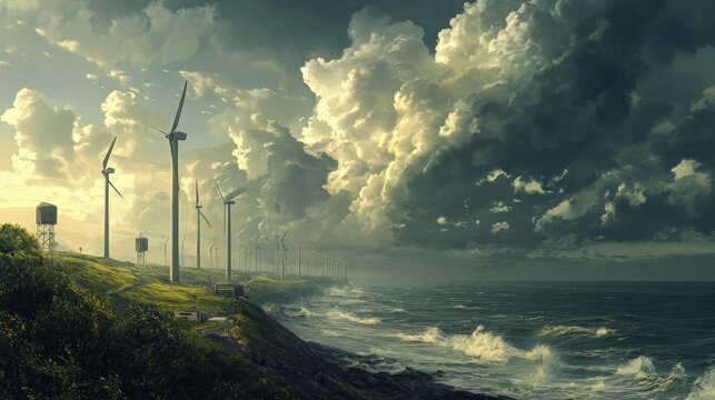 A row of wind turbines on a clear sunny day, contrasted with an industrial factory emitting smoke, showing the choice between clean energy and fossil fuels