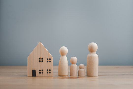 wooden doll family happy face, family home, adoption foster care, homeless support , family mental health, domestic violence, social distancing