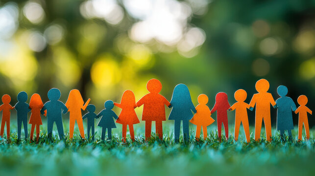 A diverse array of individuals, united by a shared concern for social well-being, held aloft paper cutouts representing various societal needs: a family, a home, an adoption foster care program,