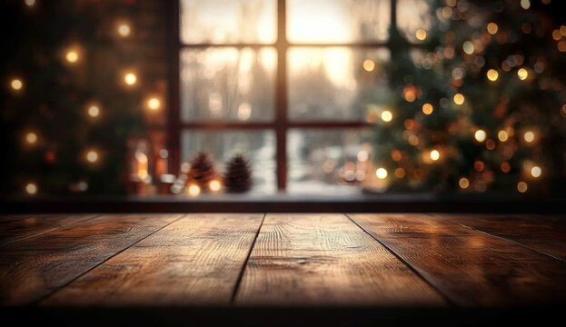Christmas Themed Wooden Table with Blurred Lights and Tree Background for Product Display
