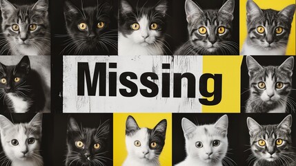 A cat is missing message on a black and white grainy grungy collage with different cats. Lost pets problem.