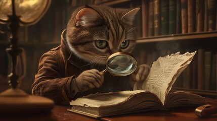 A curious cat detective in a brown outfit using a magnifying glass to inspect a torn piece of paper found in a library