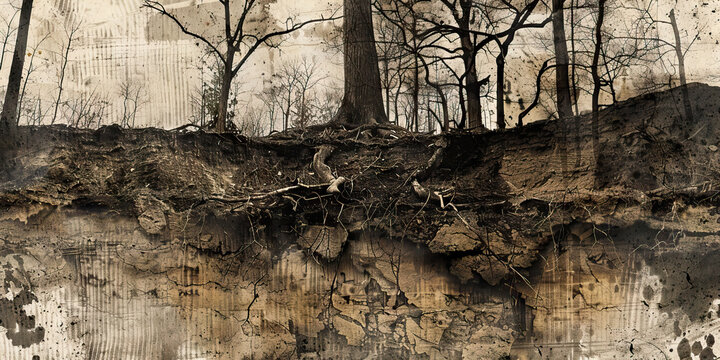 Eroded Foundations of the United States: A barren landscape with exposed roots, revealing the fragility of the nation's founding principles.