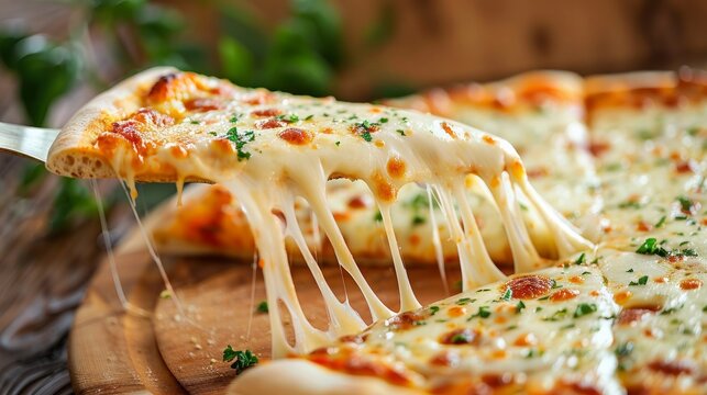 Close up and selective focus of a home cooked thin crust four cheese pizza cut in to slices on a wooden cutting board